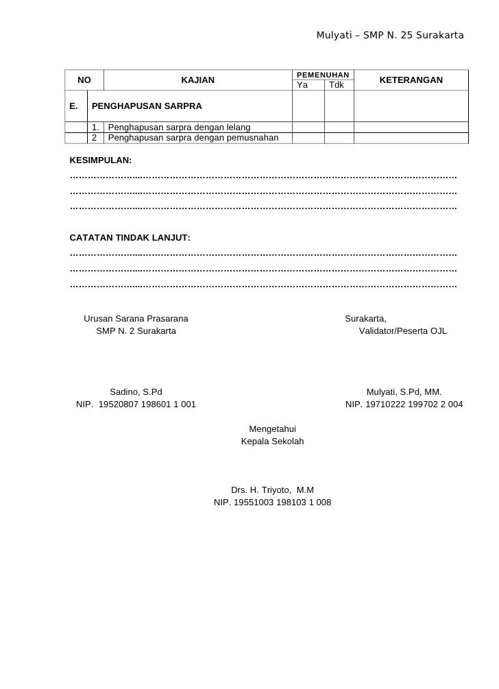 Tujuan penghapusan sarana dan prasarana adalah untuk membebaskan bendaharawan barang atau pengelola dari pertanggung jawaban administrasi dan fisik atas barang milik negara yang berada di bawah atau 2 Rika Megasari Peningkatan Pengelolaan Sarana Dan Prasarana Pendidikan Untuk Meningkatan Kualitas Pembelajaran Di SMPN 5 Bukittinggi Jurnal Administrasi Pendidikan. Sarana prasarana Penghapusan Peralatan Kantor By Anugerah Dino 951 AM Post a Comment Penghapusan peralatan kantor adalah usaha menghapuskan barang-barang milik sebuah kantor dari dalam daftar inventarisasi. 20210218 Contoh SOP Pengelolaan Sarana dan Prasarana Sekolah Data Inventaris Sarana dan Prasarana Mulai dari Perencanaan Sampai Penghapusan untuk SD-MI SMP-MTS SMA-MA SMK.